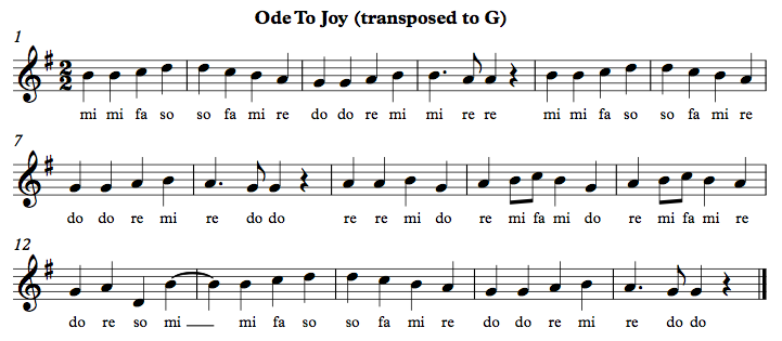 - “Ode to Joy” starting on B. The complete tune is below. Note the syncopation at the return of the first phrase in m. 12-13!