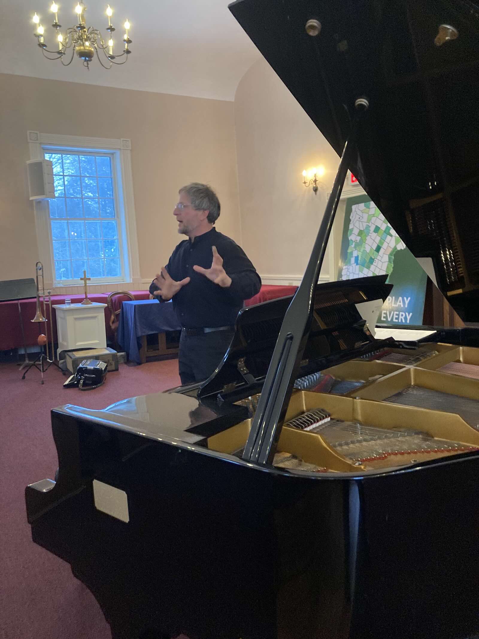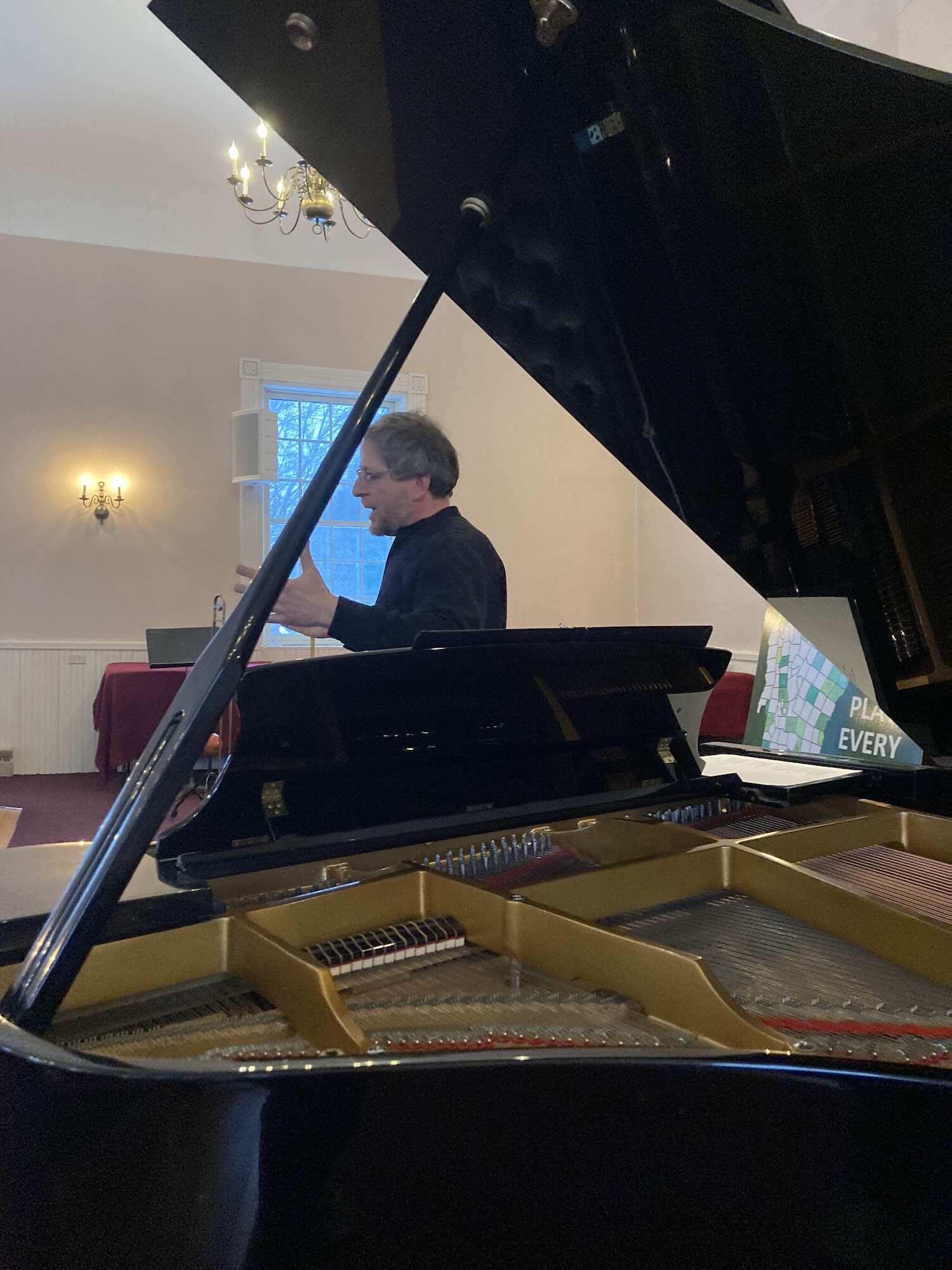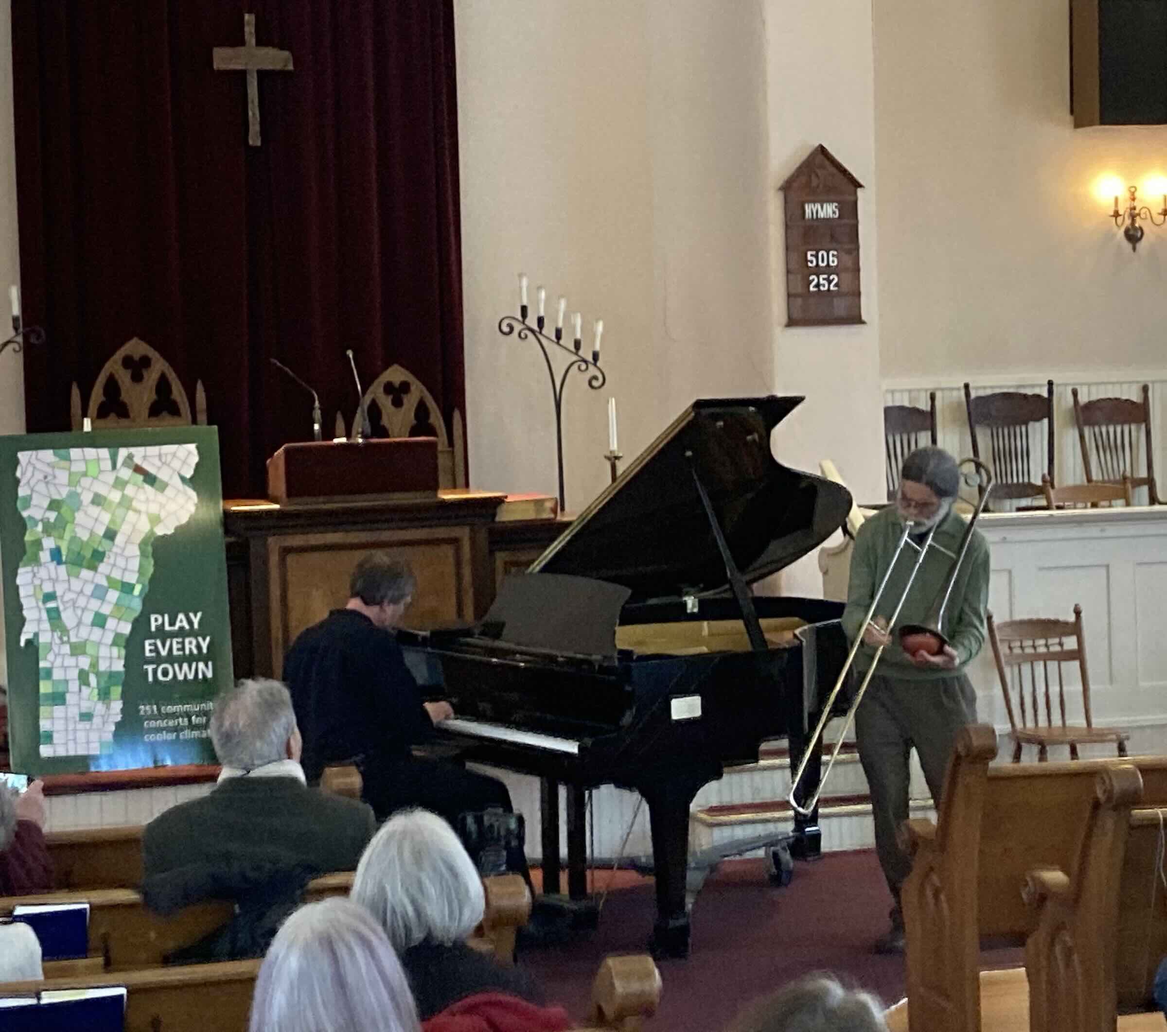 Greg LoPiccolo and David Hull invited to play in Newfane’s Union Hall. But when they informed me there was no piano there, they put me in touch with Jennifer Yocom, music director at the Congregational Church, which has a well-maintained Samick baby grand.