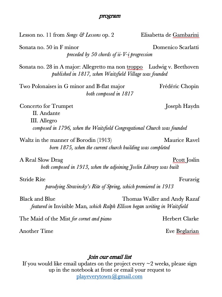 Waitsfield native Henry Whitaker joined for several pieces. He played Haydn’s Trumpet Concerto, composed in 1796, the year the Waitsfield church was organized, the first major piece for the newly invented valve trumpet. He also played Herbert Clarke’s viruouso cornet showpiece “The Maid of the Mist” and made an unannounced appearance in the second of Chopin’s first two Polonaises, written in 1817, when the village was founded.